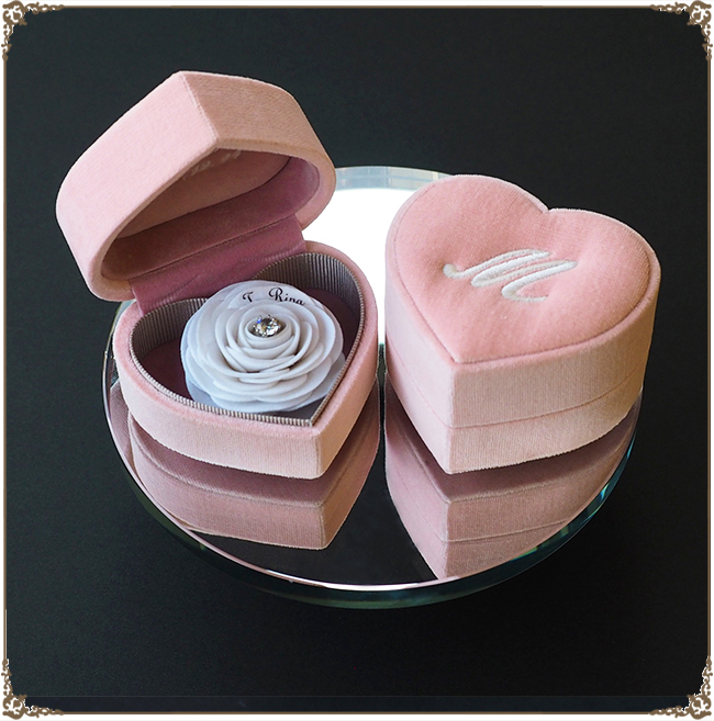 今年流行のパステルカラーのメッセージフラワーの薔薇の中心に指輪をセットできます。