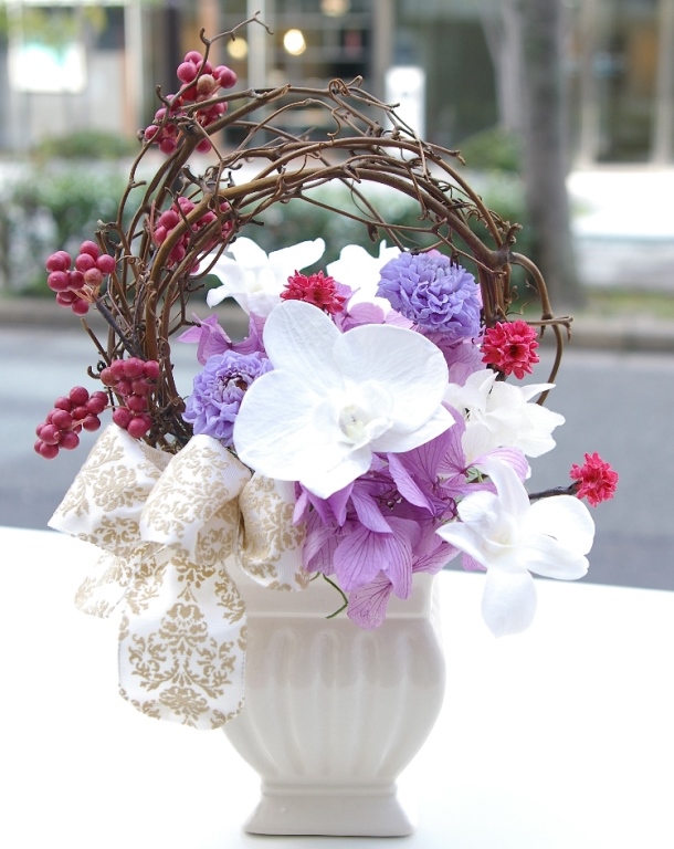 プリザーブドフラワーの胡蝶蘭をあしらい、デンファレ、バラ、マム等ふんだんにプリザーブドフラワーを使いました。