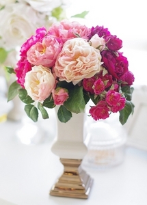 ロココ調の重厚感ある花器にピンクのバラをあしらいました。少しくすんだピンクのバラは甘さと大人っぽさを兼ね備えています。エレガントな作品です。
