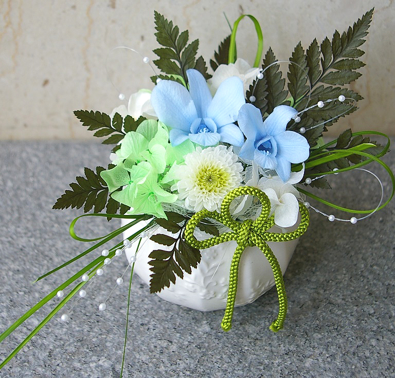 【使用している花】:プリザーブドフラワー(デンファレ・小菊・アジサイ・ベアグラス・グリーン)