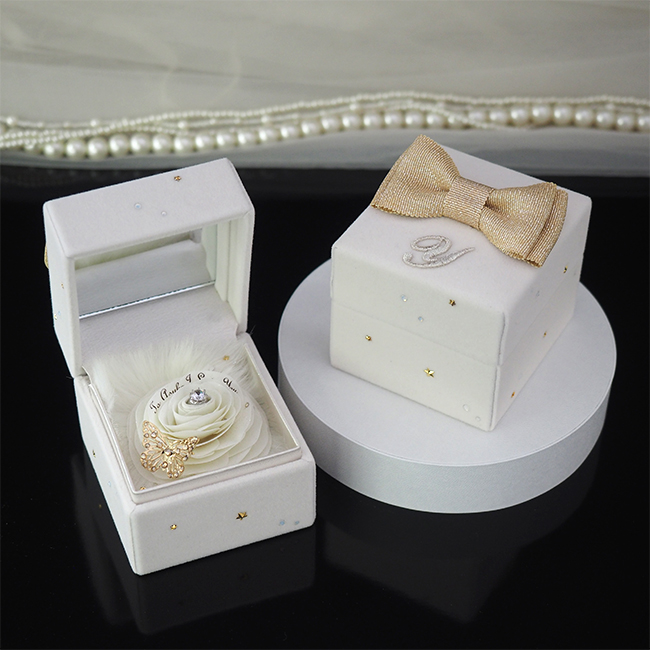 クリスマス限定バージョン!クリスマスにぴったりのシャンパンゴールドリボンを使用した華やかなデザイン。中には指輪がセットできます。※指輪はダミーですが、「Marry Me?」(結婚してください)のチャーム付きです。指輪の有無は選択できますので、ご自身で本物を入れる事もできます。 |